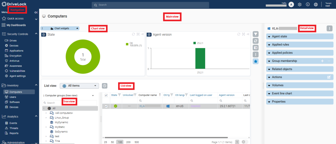 When selecting an object in the list view, the Detail view opens on the right. It shows additional information and status details for the selected object — such as a computer, user, or device.