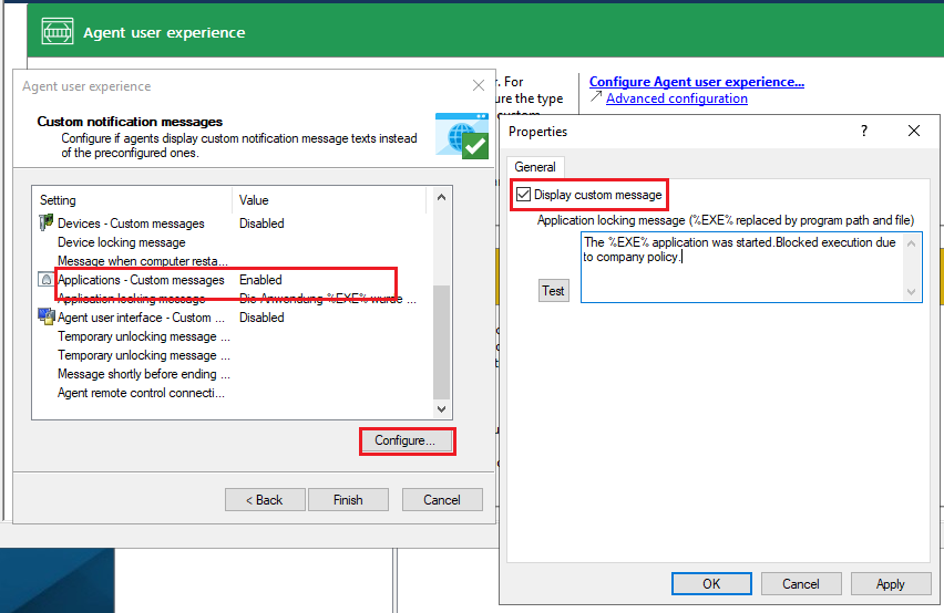You can configure the way notifications are displayed to the end user. Once you have enabled the basic settings, you can configure the agent notifications in a wizard, otherwise the settings can also be made individually via the advanced configuration.