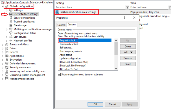 If you want to display specific icons in the taskbar information area of the DriveLock Agent or send notifications to the user, you will need to select the appropriate items and place them in the correct location (this is where they will be displayed to the user).