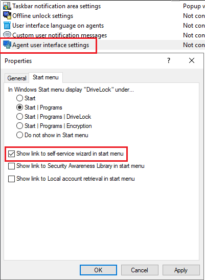 In the agent user interface settings on the Start menu tab: Show link to self-service wizard in start menu.