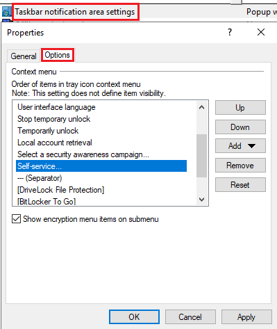 In the Taskbar notification area settings on the Options tab. Add Self-Service... and place the entry where you want it.