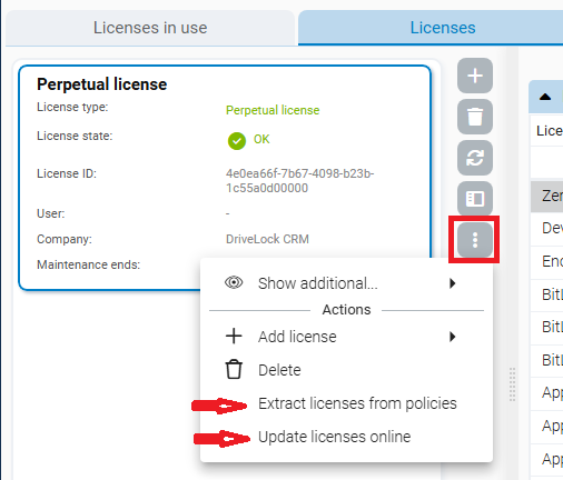 You can also use the Update licenses online menu command to manually initiate a license update. By default, the DES checks for updates every 12 hours. Use this command to automatically 'pick up' the licenses after license renewal so that they can then be updated in your license policy.