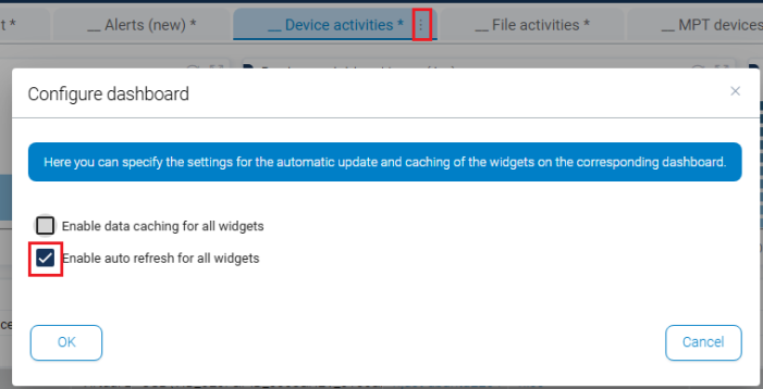 When activated, all widgets in the tab are automatically refreshed at defined intervals (default: 300 seconds).