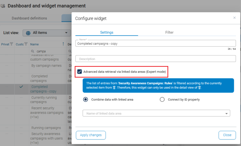 The advanced mode allows retrieving data from linked schemas (data areas). The existing filter is automatically extended by the selected object. This function is intended for complex widget scenarios and should only be used when the structure of the schemas is well understood.