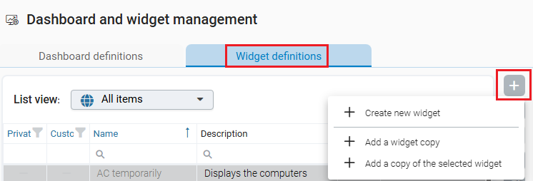 Built-in widgets cannot be edited, but they can be copied. Using the Add widget copy command, you create a copy of a widget that can be fully customized. Created widgets can also be copied, for example to use different variants on different dashboards.