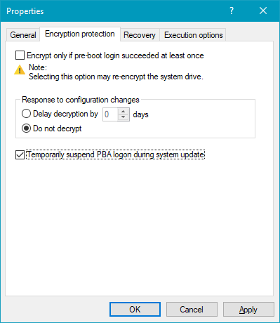 Temporarily suspend PBA logon during system update: If this option is activated, the BitLocker or DriveLock PBA logon is temporarily suspended during a Windows system update. Once the update is complete, encryption is automatically reactivated. This ensures compatibility and prevents possible conflicts during the update process.