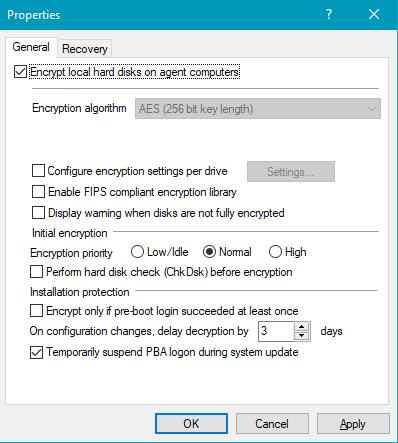 If you want to delay decryption for some time, specify the number of days with the On configuration changes, delay decryption by x days setting. This may be useful so that the client computers and their users can be properly prepared for decryption.