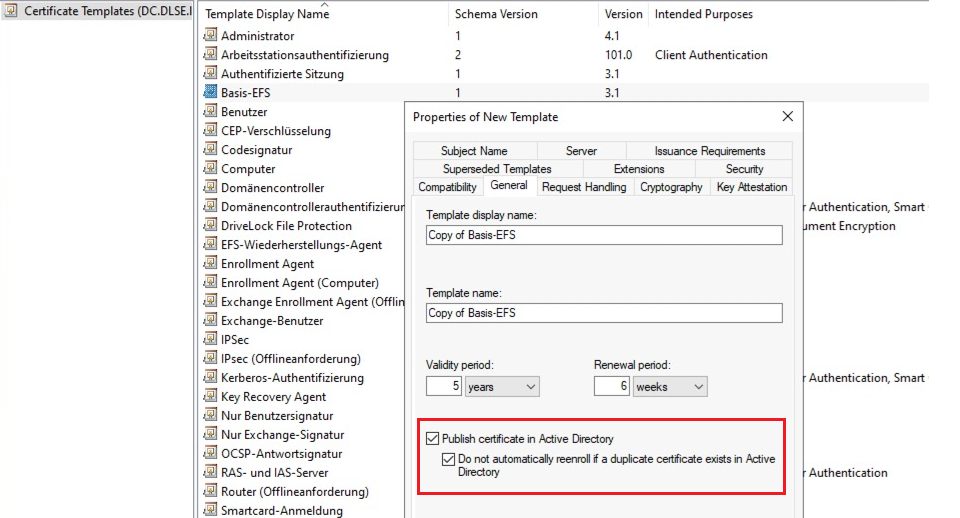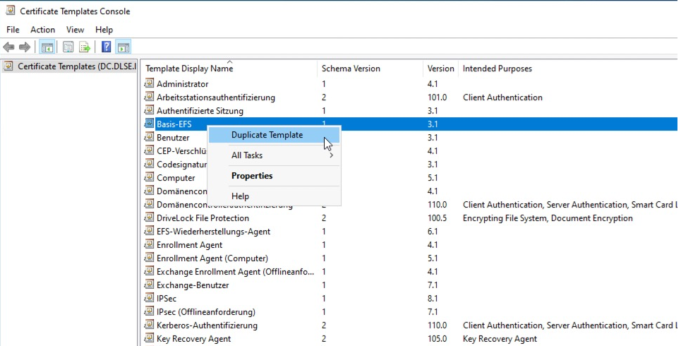 On the CA server, open the Certificate Template Console certtmpl.msc and right-click Basis-EFS.
