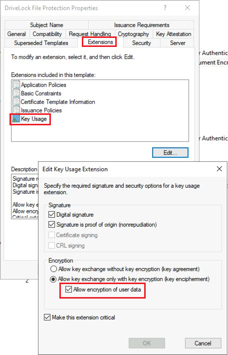 On the Extensions tab in Key Usage, place a check mark next to the Allow encryption of user data option and confirm with OK.