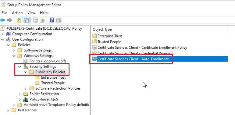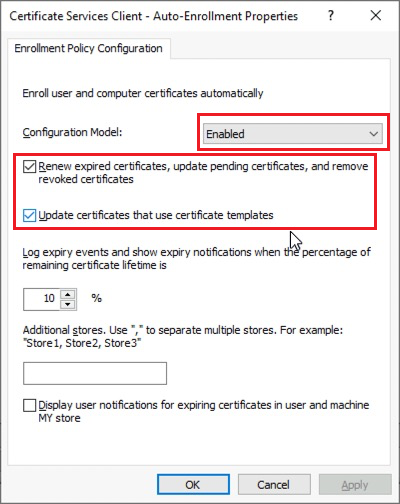 Under the Public Key Policies, find Certificate Service Client - Auto-Enrollment. Open the properties of this object type and select the following options: