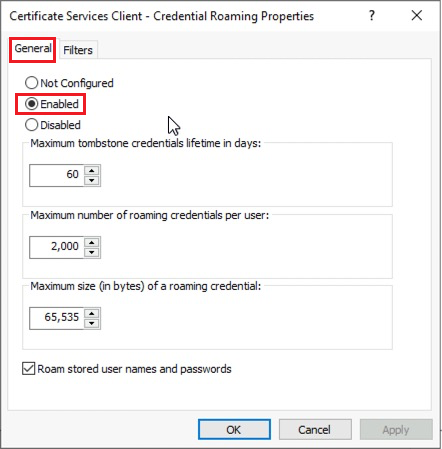 In order for the user certificate to roam to all computers on the network ("Certificate Credential Roaming"), enable Credential Roaming.