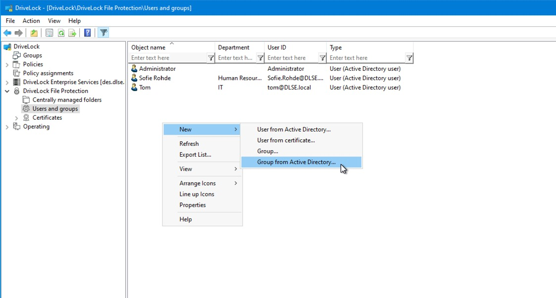 For this purpose, go to New in the Users and Groups submenu and select a user or group from the Active Directory.