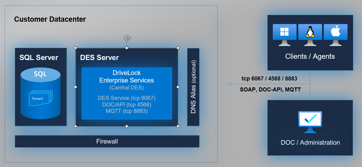 The central DriveLock Enterprise Service (DES) relies on a database for storing the configuration and feedback from the agents.