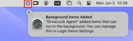 The DriveLock Agent app has now been successfully added and the DriveLock Agent icon will be displayed in the menu bar as follows