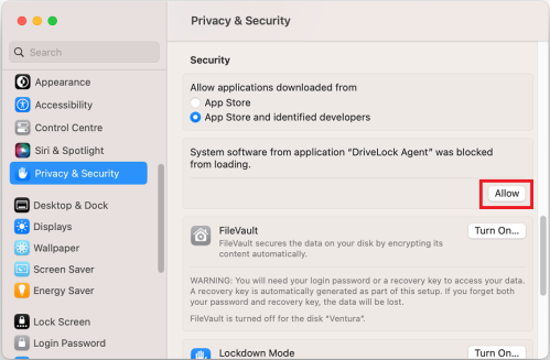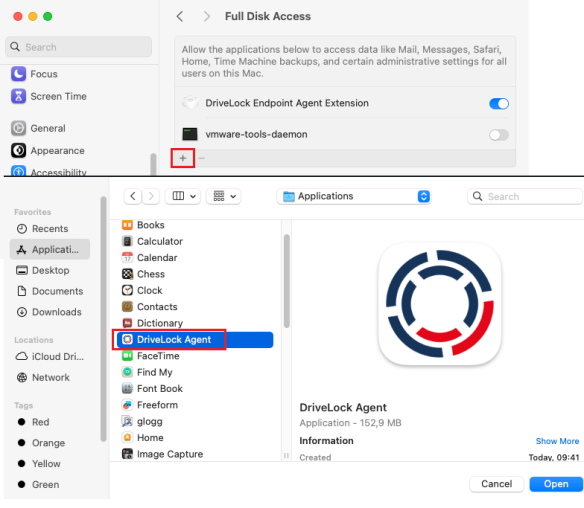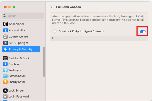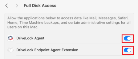 Then activate full disk access for the DriveLock Endpoint Agent Extension in the System Settings/Settings -> Privacy & Security area.