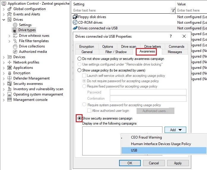 In the Drive types section, select the drive you want to display a security awareness campaign for. In the example below, this is a USB bus connected drive.