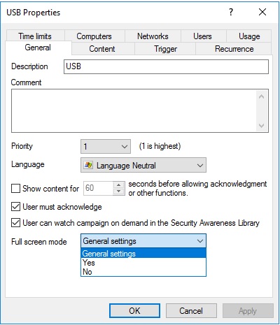 Select General settings if you want to use the security awareness settings that apply to all campaigns for this specific campaign.