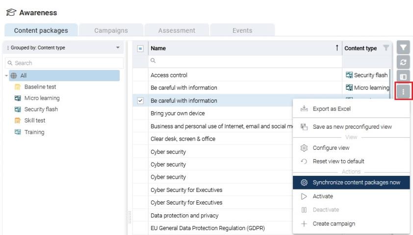 If you are using the DOC, you can also synchronize the content packages manually by using the Synchronize content packages menu command under Awareness on the Content packages tab as shown in the figure.