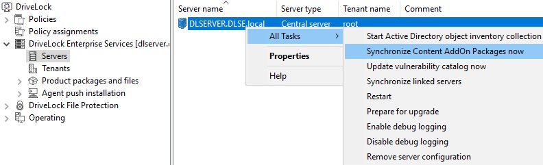 If you are using DriveLock On-Premise, you can also synchronize your content packages manually from the DriveLock Enterprise Service (DES) by proceeding as follows: