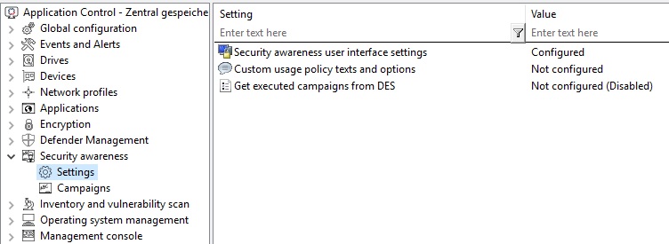 In the Security Awareness node in your policy, you can configure general details for all campaigns in Settings.